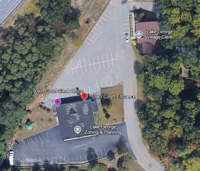 - If you have a scheduled court date, please drive to the backside of the Town of Lake George municipal building. The backside of the municipal building has a parking lot that’s shared with the Village of Lake George. There will be a door on the left for you to enter. The Town has also provided directional wall signs on the building to guide you to where you need to go.