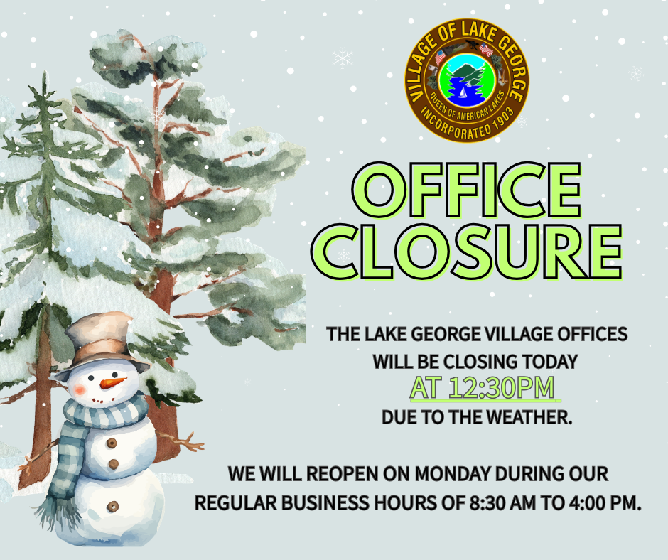 Due to current weather conditions, Village Hall will be closing early at 12:30 PM on Friday, February 20, 2026. We will reopen on Monday, February 23, 2026, during our regular business hours of 8:30 AM to 4:00 PM.
